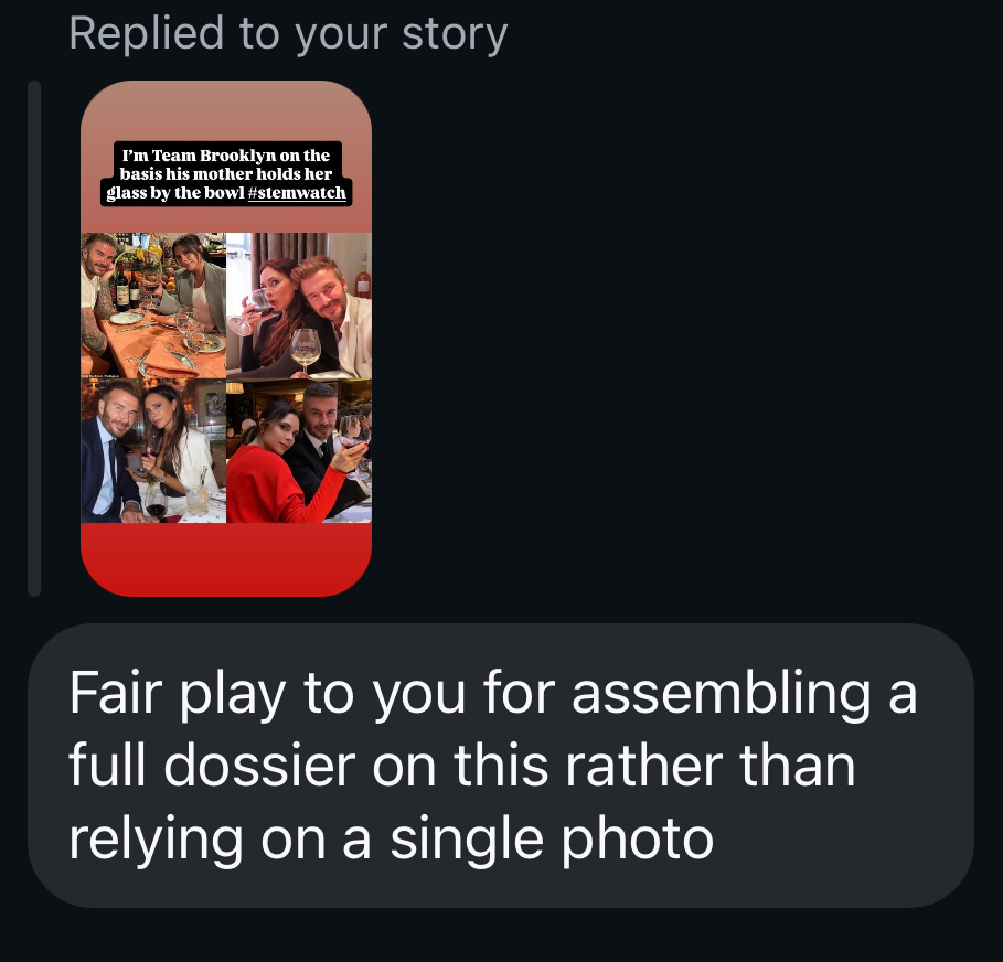 I noted last week - with sadness - that wine influencer Brooklyn Beckham has cut contact with his parents. And wondered if possibly his mother’s stem holding had anything to do with it